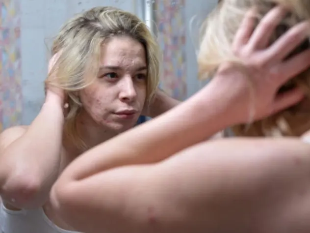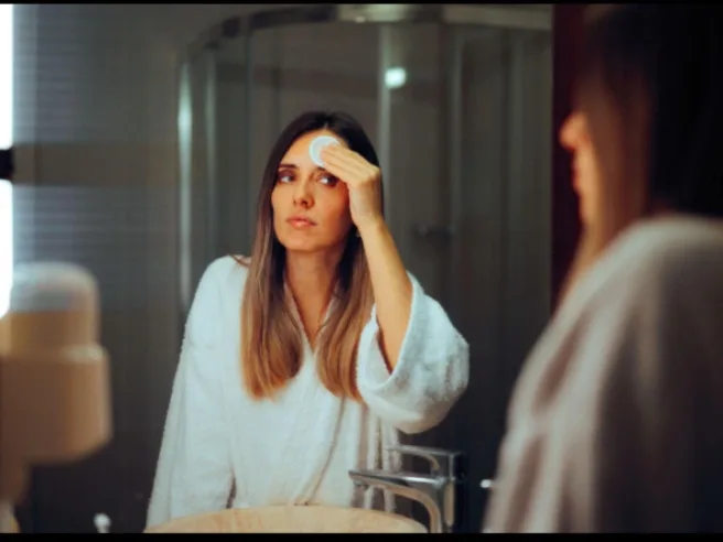 The smooth, perfect skin disappeared, and her real skin came forward — uneven, marked, and vulnerable.
